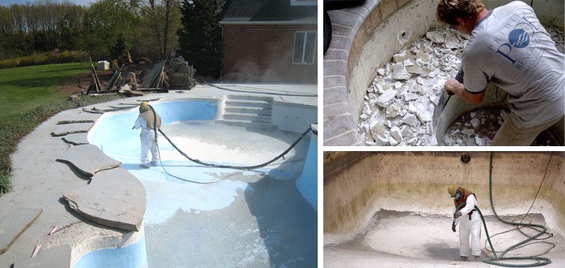 Sandblasting is a major part of a pool restoration job in which the pool has been previously painted. The new plaster interior must be applied over a properly prepared concrete surface free of paint.